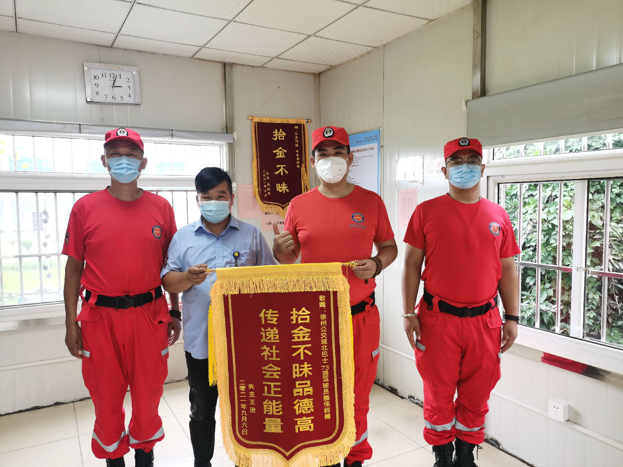 當天上午950分左右,乘客王先生從煙廠乘坐73路趕往仁慈醫(yī)院交住院費,下車時只顧拎著大包急匆匆往醫(yī)院趕,繳住院費時才發(fā)現(xiàn)裝有現(xiàn)金的小包沒了。王先生意識到,小包可能遺落在了公交車上,于是急忙出門打車,來到了楊山路調(diào)度室找尋,沒想到小包已經(jīng)被鹿偉師傅撿到交到了調(diào)度室。王先生緊握鹿偉師傅的手連連致謝,并撥打了12345市政熱線對其進行了表揚。97日中午,他又帶著錦旗來到楊山路調(diào)度室,再次對鹿師傅拾金不昧精神表示感謝。