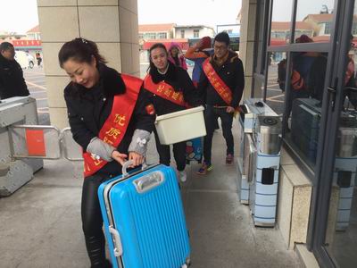 ?xml:namespace>。志愿者們身披綬帶深入各大站點(diǎn)、車場(chǎng),開展站臺(tái)咨詢,導(dǎo)乘服務(wù),主動(dòng)扶老攜幼,為乘客兌換零錢,共發(fā)放乘車指南1000余份,深受乘客歡迎。圖為賈汪公司志愿者在幫助江蘇安全技術(shù)職業(yè)學(xué)院開學(xué)返校的學(xué)生運(yùn)送行李。