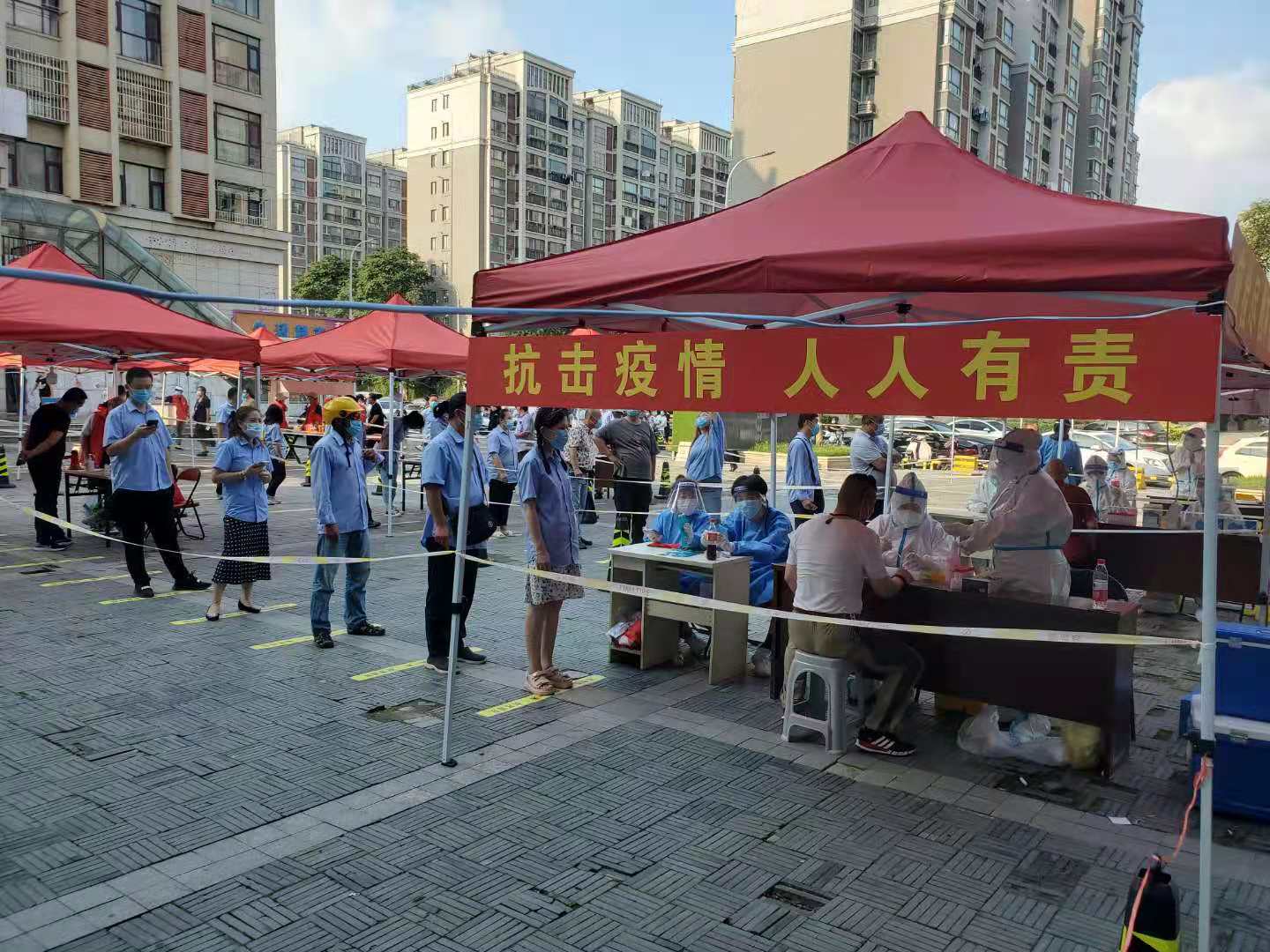 在銅山新區(qū)樵村社區(qū)檢測(cè)點(diǎn),新區(qū)公司指定專人現(xiàn)場(chǎng)維護(hù)秩序、登記信息、疏導(dǎo)人員,全方位抓緊、抓實(shí)、抓細(xì)每個(gè)環(huán)節(jié)。請(qǐng)大家佩戴好口罩,保持間距。”“請(qǐng)大家排好隊(duì),提前拿出身份證,打開行程碼和健康碼……”檢測(cè)現(xiàn)場(chǎng),工作人員不斷引導(dǎo)員工做好檢測(cè)前的準(zhǔn)備工作。