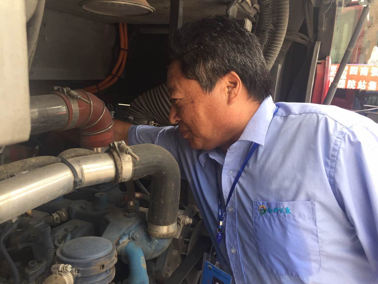 刺眼的陽光照射下,車站的水泥地熱得發(fā)亮,例檢員如軍號般的聲音響起:“大燈,變個光,霧燈,轉(zhuǎn)向燈,右邊?!毖矍斑@位正在對車燈進行檢查的人叫彭夢廷,是兆通公司銅山站的一名例檢員。為了保證每一輛出站車輛的安全,老彭和他的同事每天要對所有出站車輛進行十幾項安全檢查,車輛外觀、制動、轉(zhuǎn)向、安全設(shè)施、燈光、雨刮、剎車、傳動部位、輪胎、發(fā)動機滲漏油、空調(diào)等每一個環(huán)節(jié)都不能馬虎。老彭說,多年例檢經(jīng)驗讓他對車站每一輛車的情況都了如指掌,哪輛車缺零件、哪輛漏油他都能迅速做出故障判斷并要求司機立即整改。
