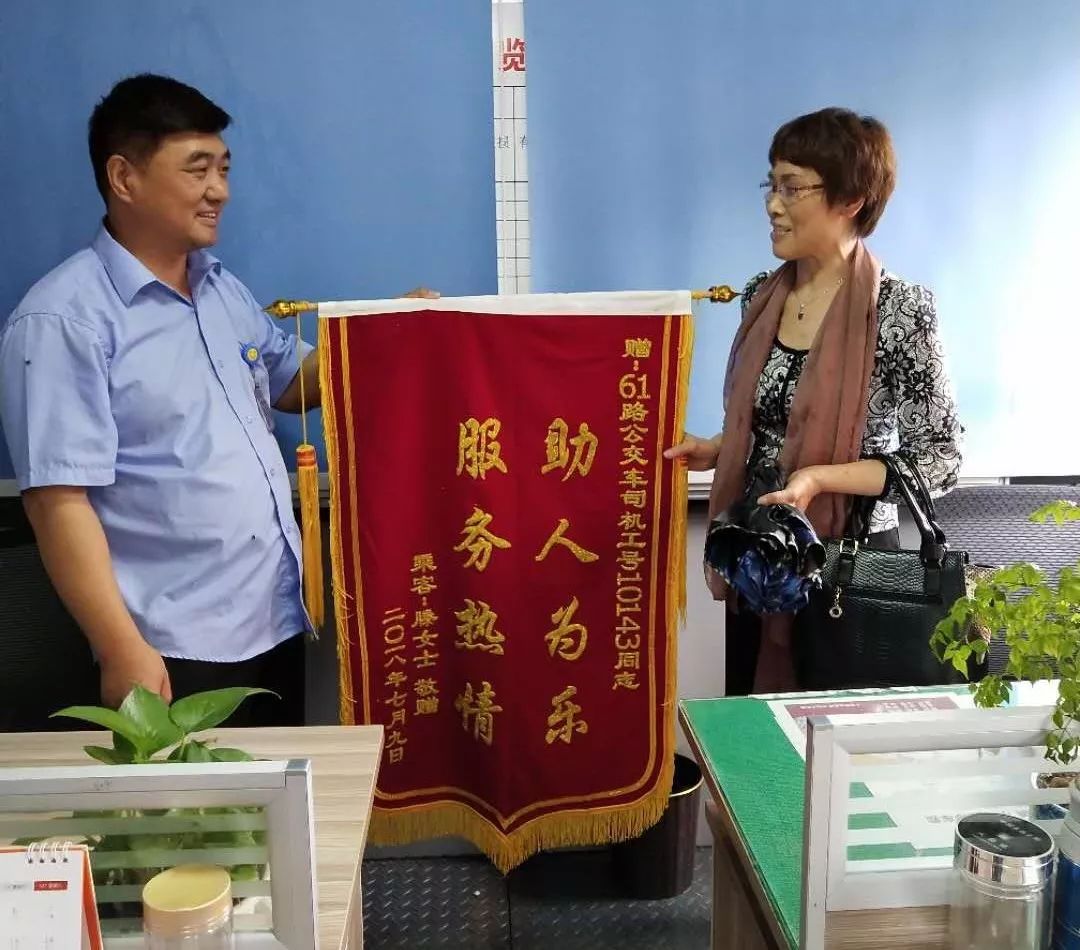 7月9日,市民滕女士到宣武車站,送來一面錦旗,專門感謝61路駕駛員段世望。